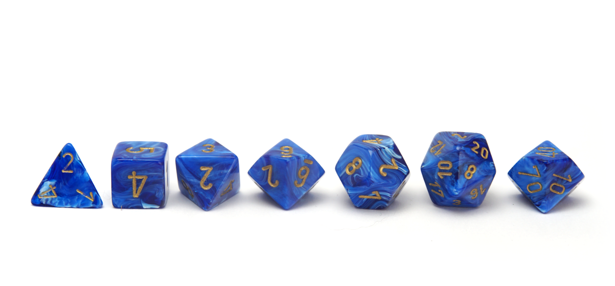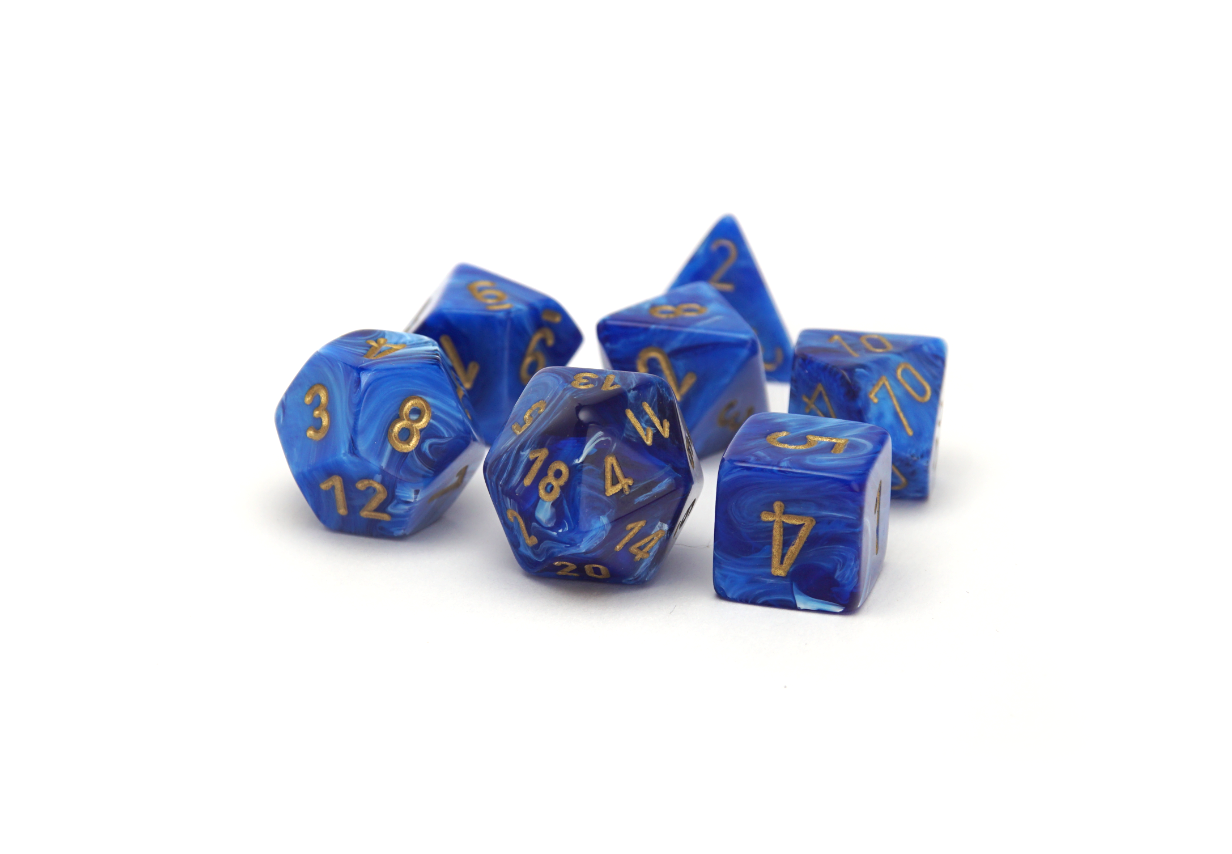 These dice are a mixture of deep ocean blues swirling together in a gorgeous saphire maelstrom, topped off with delicate gold ink.