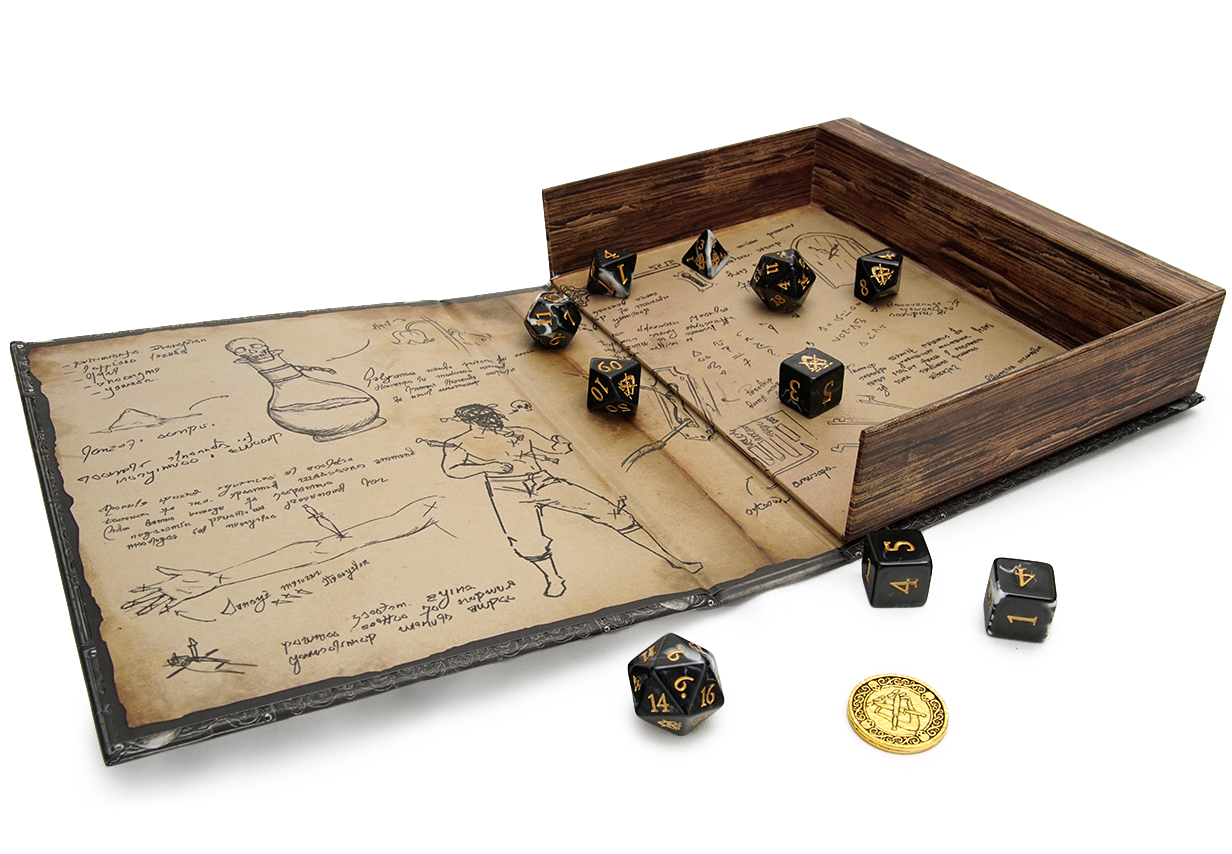 This sneaky book hides the tools any rogue needs, including an expanded polyset of 10 dice and a coin for good measure.