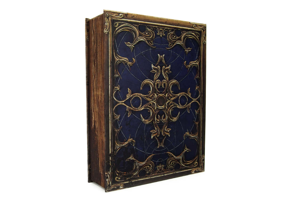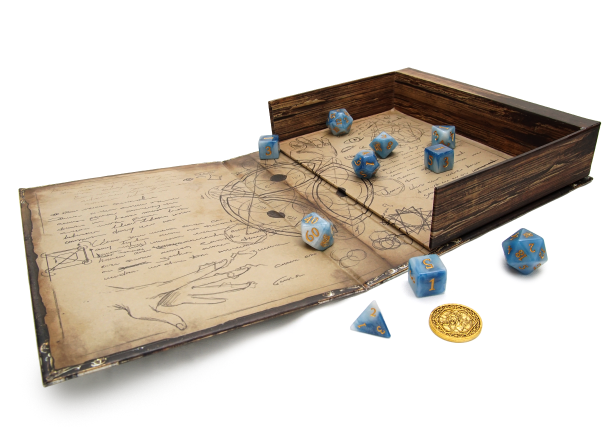 The casing of the book itself may also serve as an impressive dice tray, decorated with thematically appropriate symbolism and art!