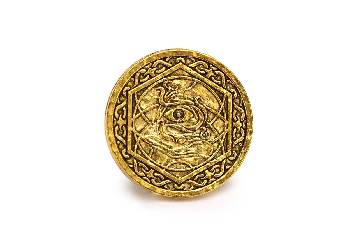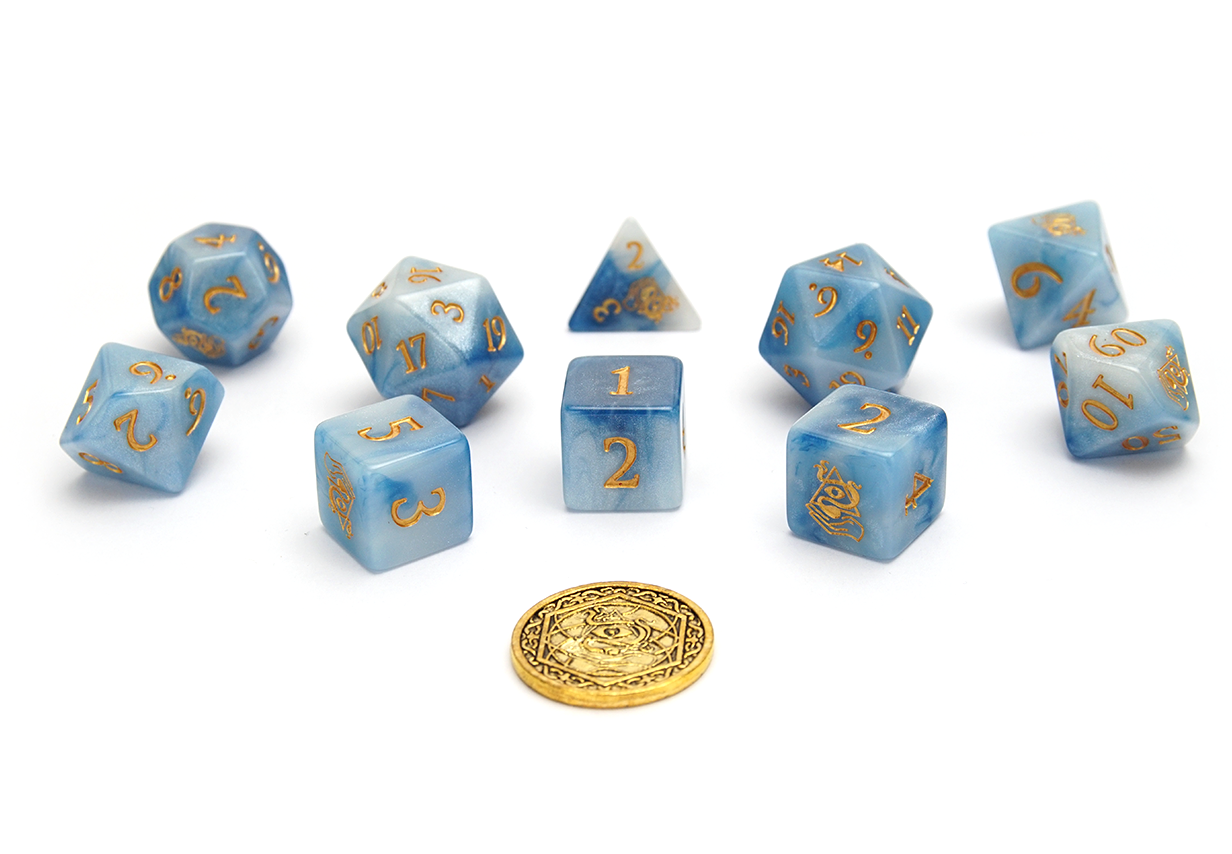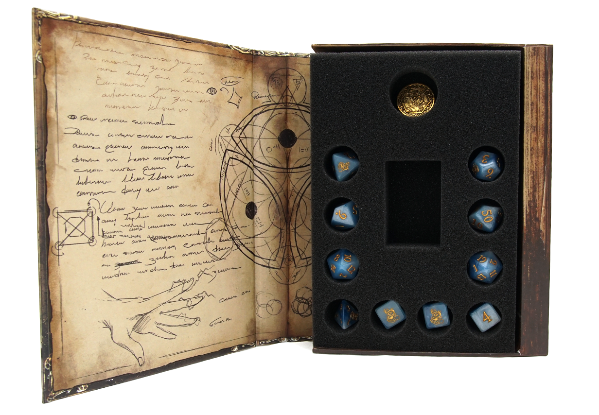 This mystical book contains everything you need to embark on your magical career, including an expanded polyset of 10 dice and a golden coin to further refine your fate.