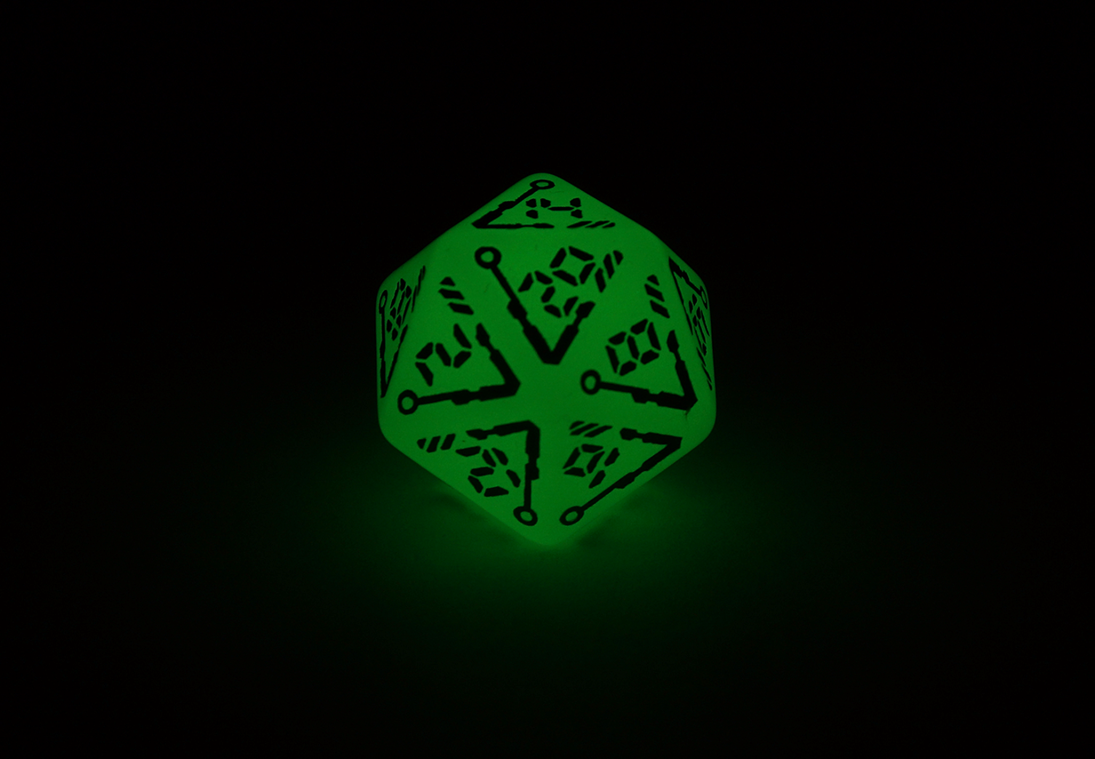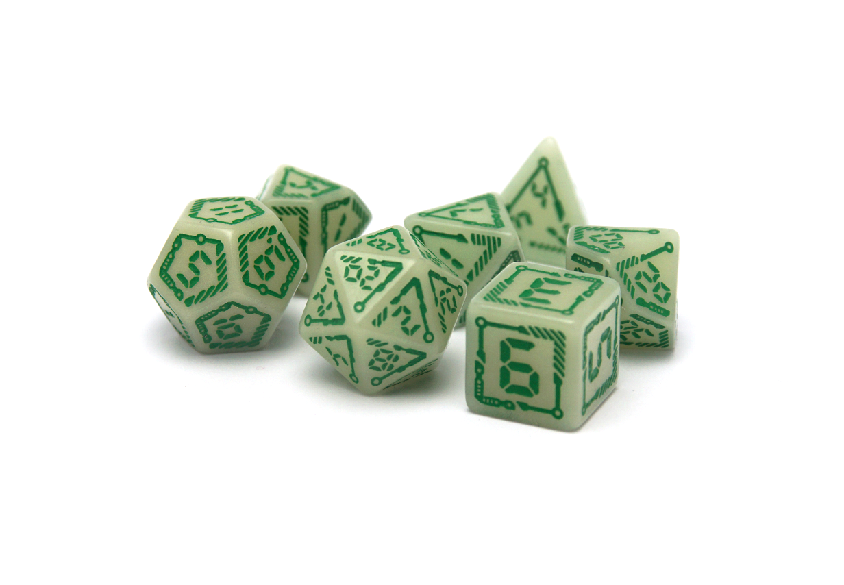 What's more, when charged through exposure to light, these dice will glow! Let them light your way through your dystopian cyberpunk campaign!