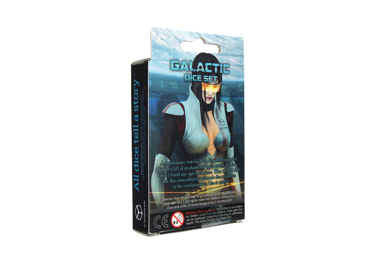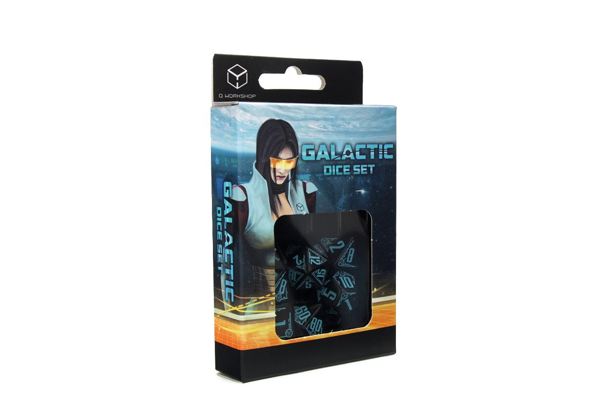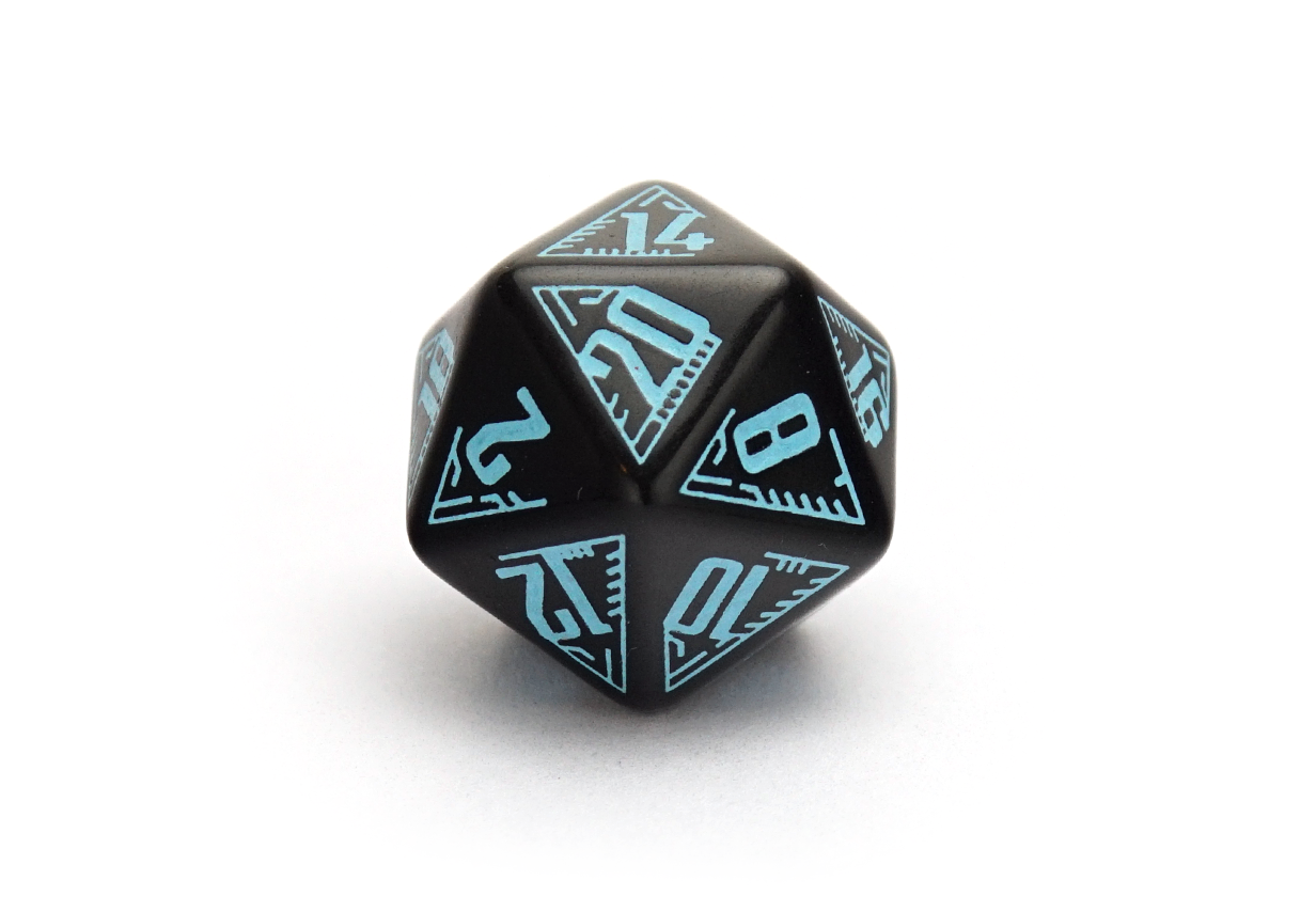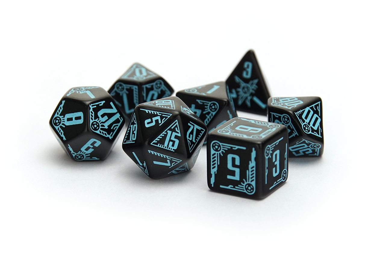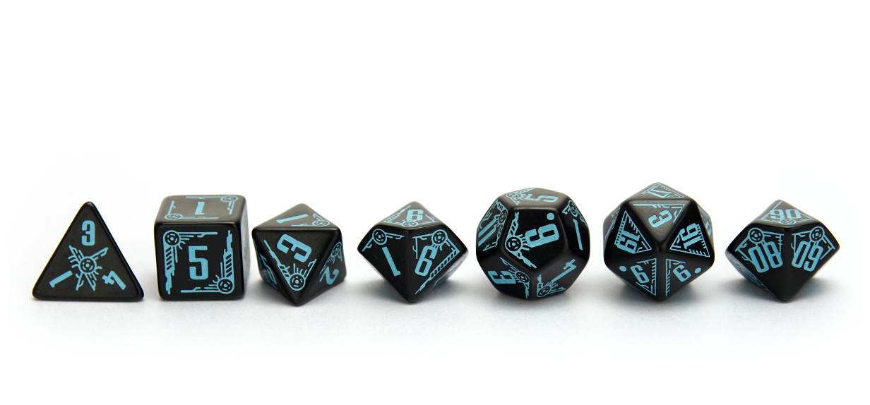 With their light blue and black colouring and adorned with technological futuristic imagery, this polyset is perfect for any sci-fi campaign setting.