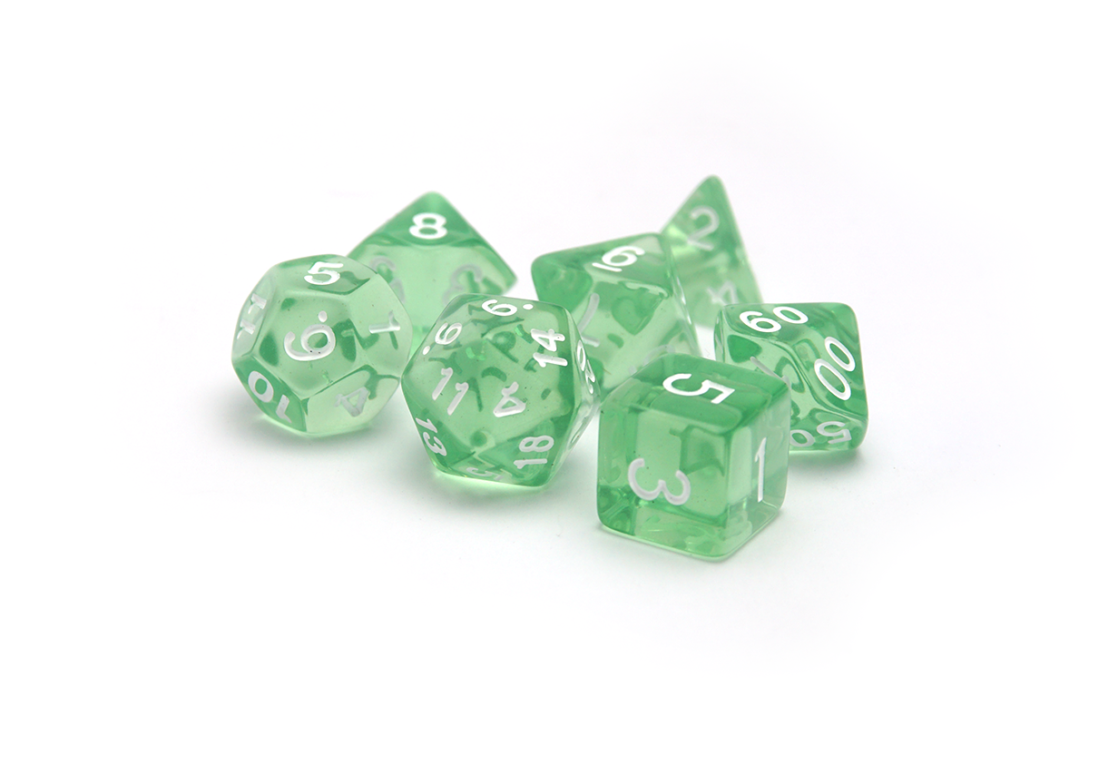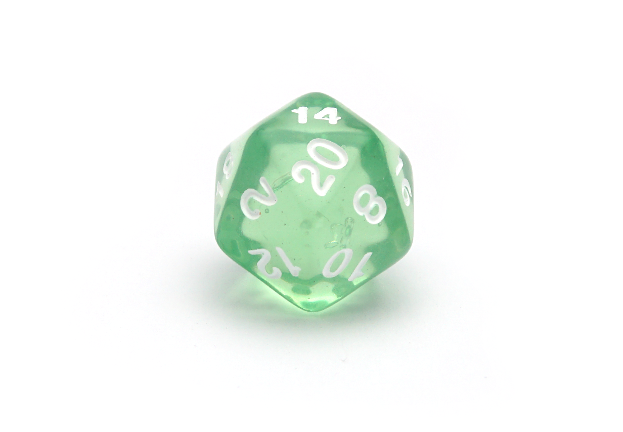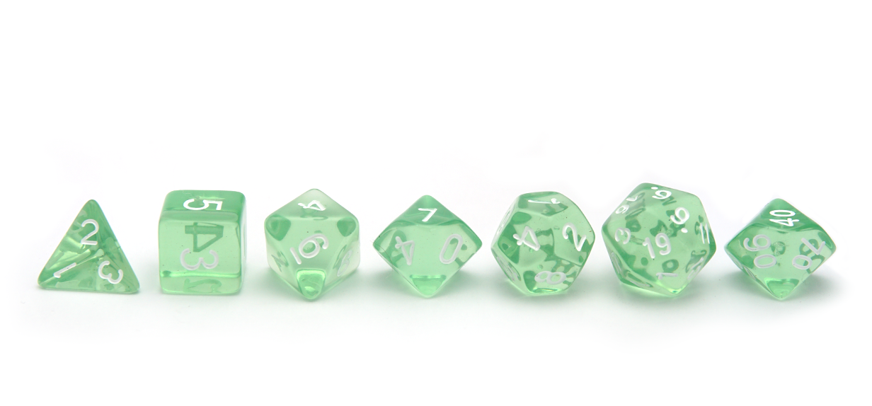 Crystal clear resin cast dice with crisp numbering and vibrant colour. Ideal for new adventurers!