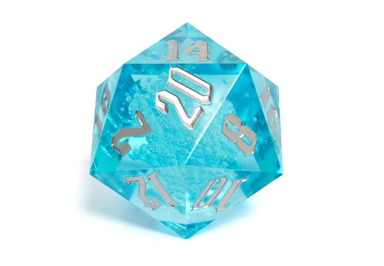 Featuring a bubbling light-blue resin interior, sharp edges, and a gothic font painted in striking silver.