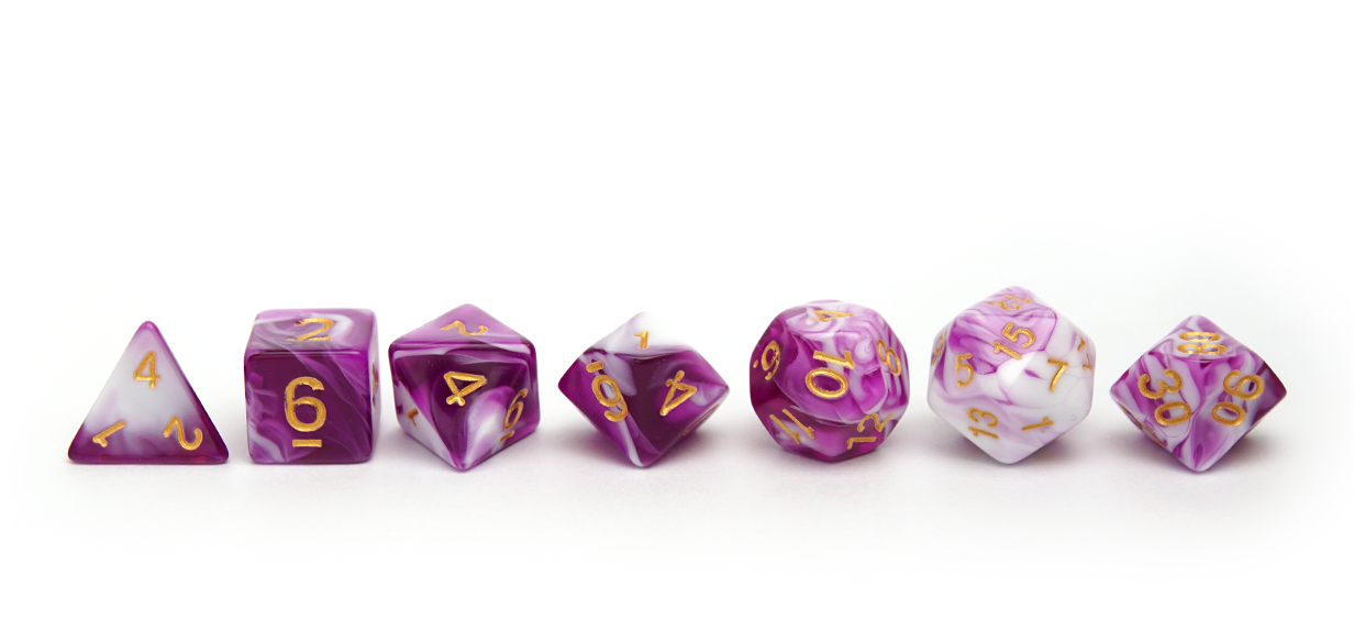 Vibrant swirls of strong blueberry purples surrounded in creamy whites. An absolutely delicious set of dice! They will ensure any foes get their just desserts.