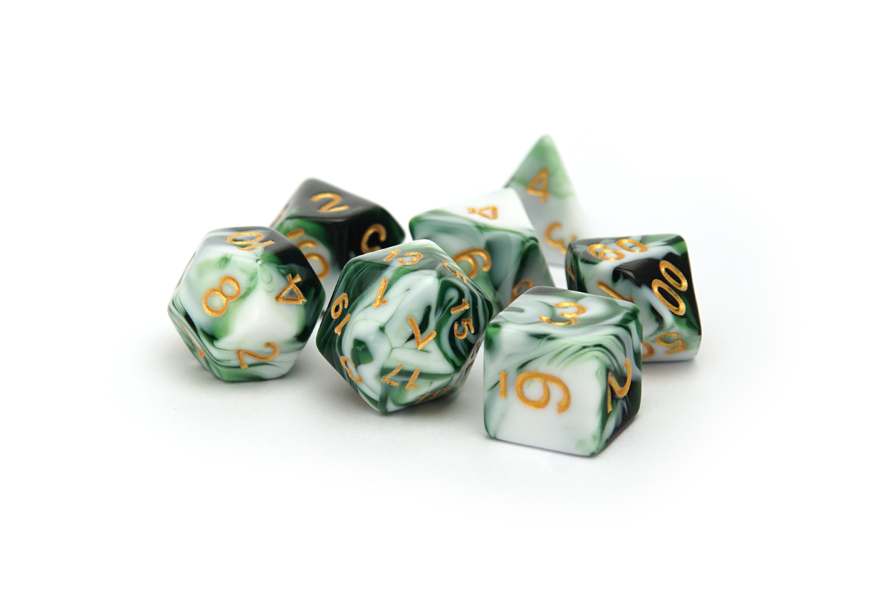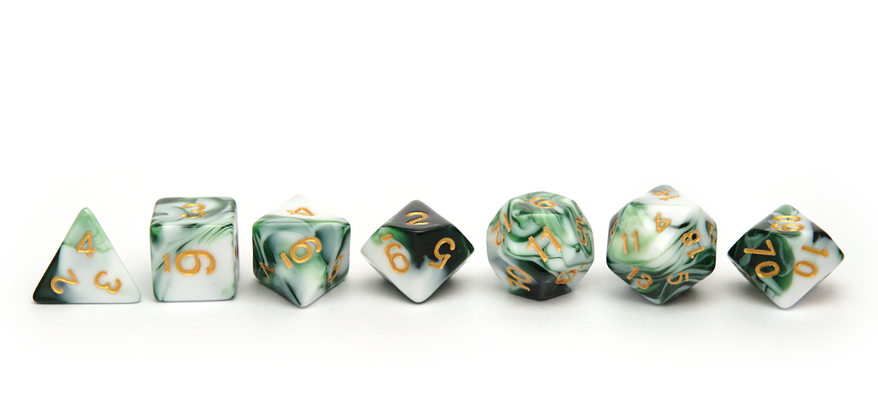 While there's going to some variation due to style of resin, the dice I received are amazing! Very little blending between the colours so you get crisp dark green into bright white. One die was almost completely emerald green which was absolutely fine because it's such a stunning colour! From the first few rolls there's good variation in the numbers produced.