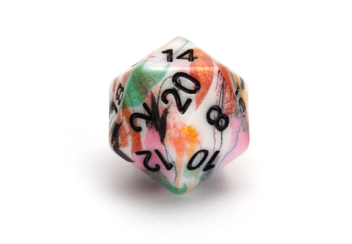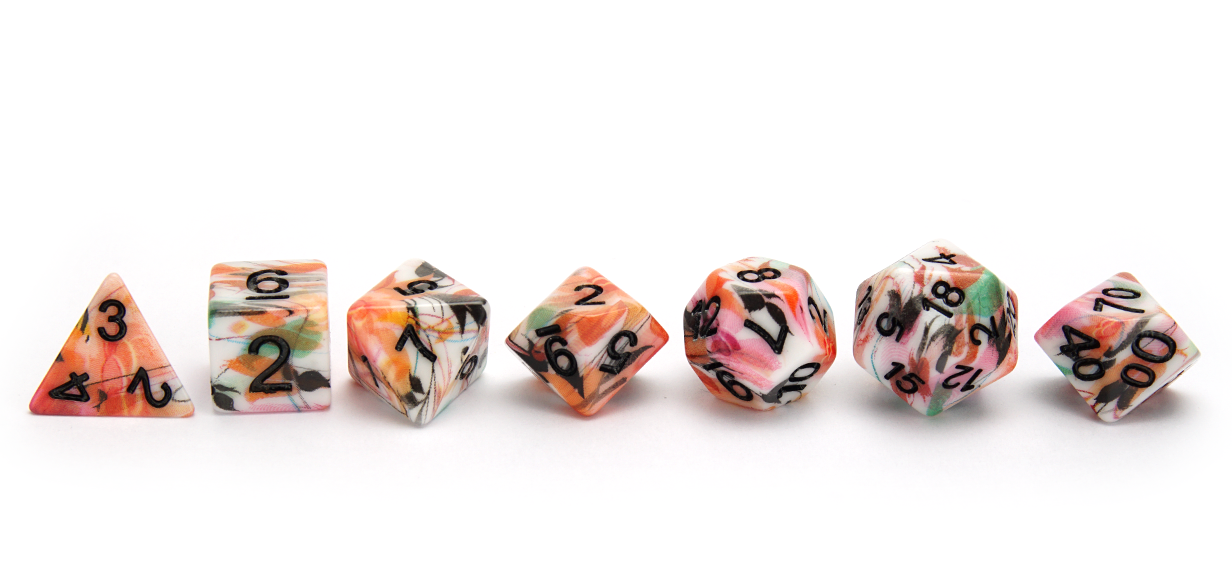 A charismatic dice polyset, consisting of white resin dappled with leaflike shapes in the reds oranges and browns typically associated with the autumnal season. Finished with black ink numerals.