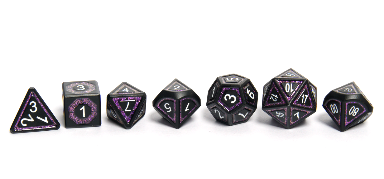Distinguished metal dice with a matte black coating and alluring glittering purple enamel, finshed with fine white ink.