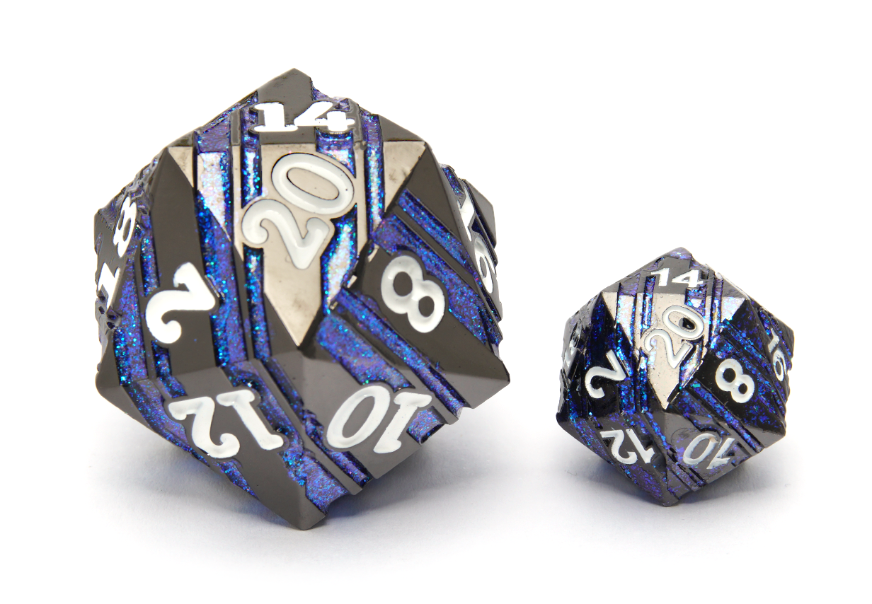 Enchanting black brushed metal dice with crystalline veins of glittering blue streaks carved into them, and numerals coated in fine enamel paint.