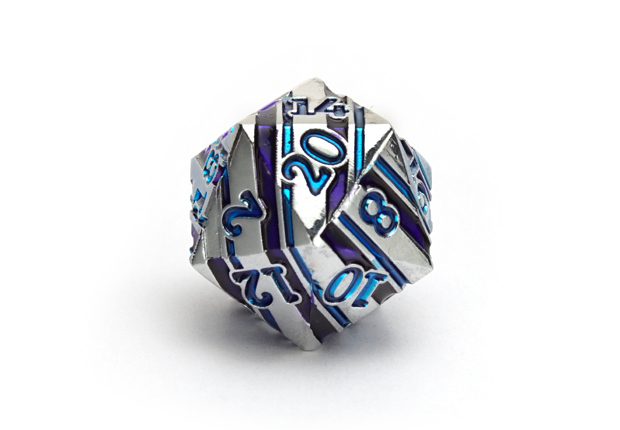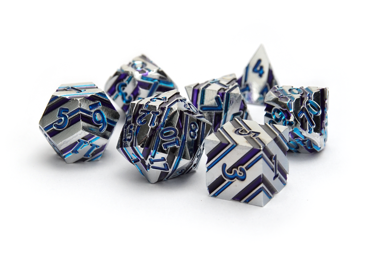 Polished silver metal dice with crystalline veins of purple and blue carved into them, and numerals finished in deep blue enamel paint. This premium metal polyset is sure to make an impression at your table!