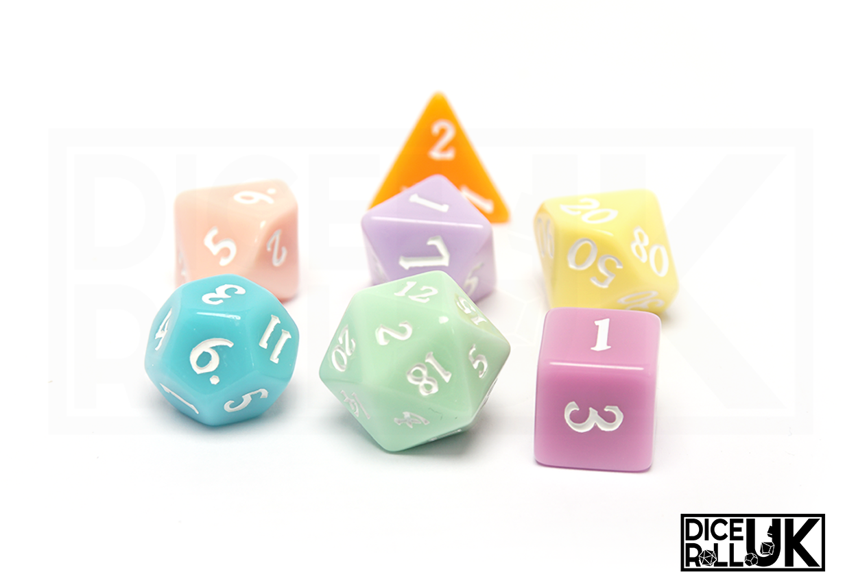 An assortment of beautifully vibrant yet muted dice, each dice a unique and soft pastel colour, all finely finished with a white ink that helps makes the sharp numbering stand out.