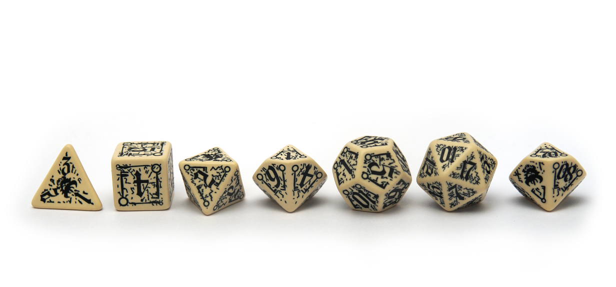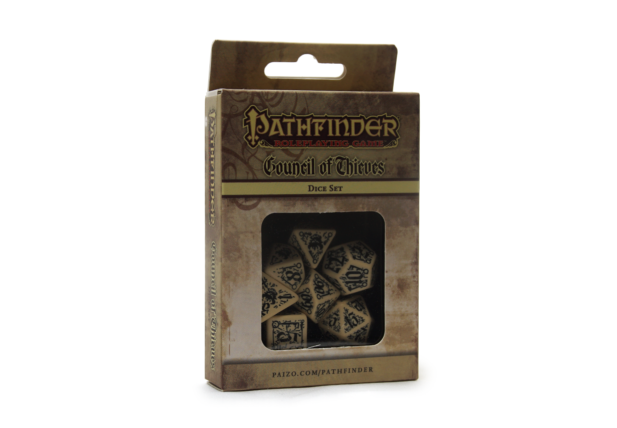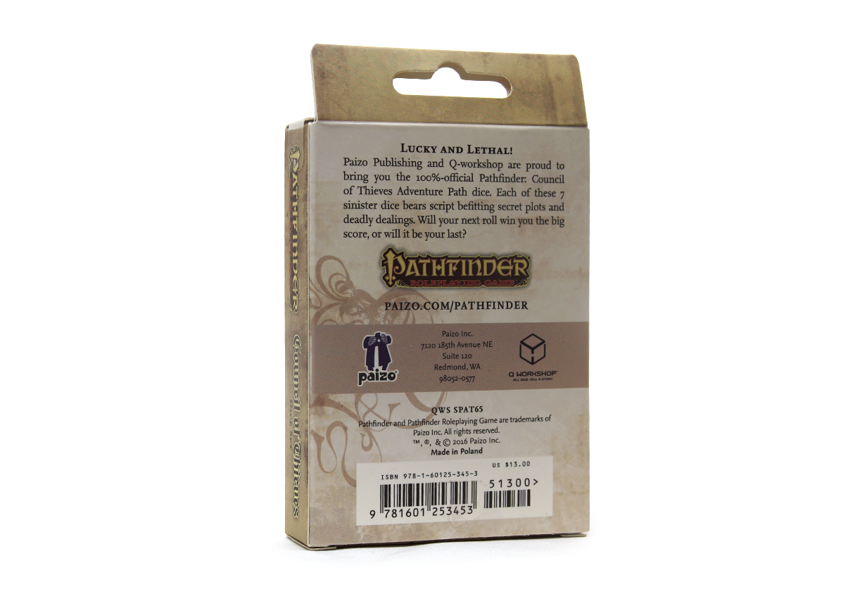 Paizo Publishing and Q-workshop are proud to bring you the 100%-official Pathfinder: Council of Thieves Adventure Path dice. Each of these 7 sinister dice bears script befitting secret plots and dealdly dealings. Will your next roll win you the big score, or will it be your last?